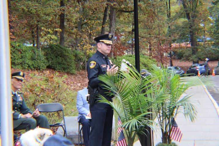 Retired Lt. Col. Thomas Ariail discusses the role of memory in the lives of American service members transitioning back into civilian life at the Nov. 11 Dunwoody Veterans Day Ceremony at Brook Run Park. Dunwoody Mayor Lynn Deutsch and Police Chief Mike Carlson, pictured left, also spoke to the crowd of 100.