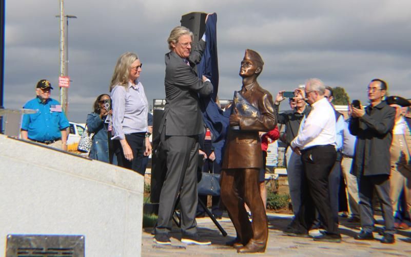 Artist Curtis Pittman, left, cheers as local philanthropist and business leader Sunny Park, right, and his family cut the ribbon Nov. 11 on Veterans Park’s new sculpture — “Be the Light.” The Veterans Day ceremonies in Sandy Springs also saw the unveiling of Kevin Chambers’ “Three Generations” at the park.